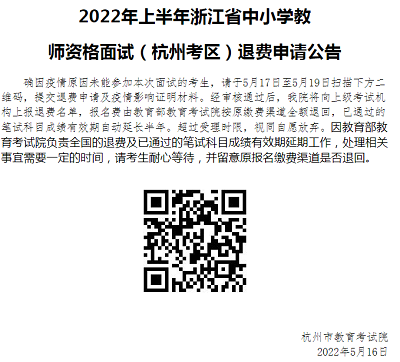 2022年上半年教資面試(杭州考區(qū))退費申請公告