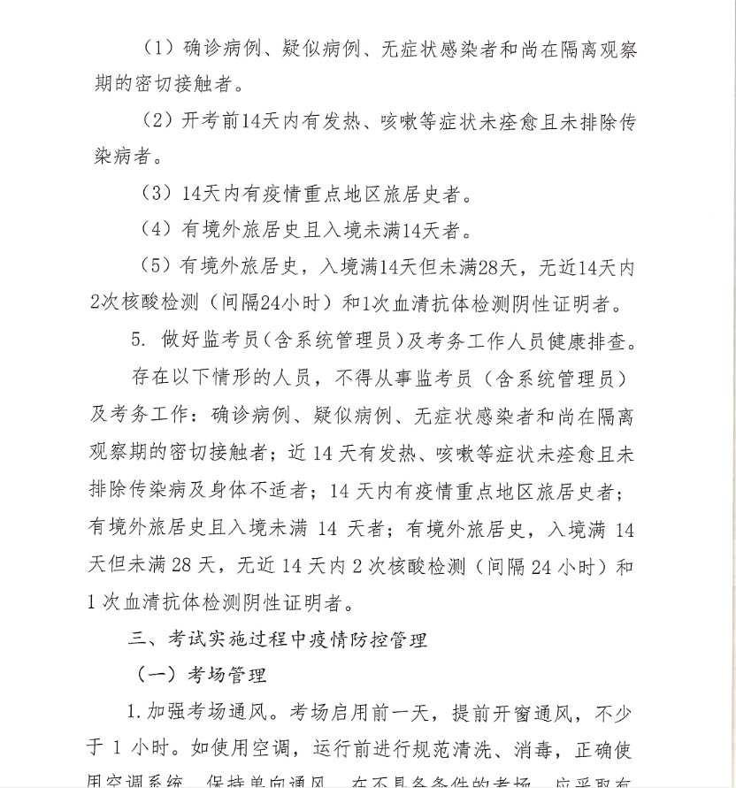 (3)屬于以下情形的,不得參加考試:①確診病例、疑似病例、無癥狀感染者和尚在隔離觀察期的密切接觸者;②開考前14天內(nèi)有發(fā)熱、咳嗽等癥狀未痊愈且未排除傳染病者;③14天內(nèi)有疫情重點地區(qū)旅居史者;④有境外旅居史且入境未滿14天者;⑤有境外旅居史且入境滿14天但未滿28天,無近14天內(nèi)2次核酸檢測(間隔24小時)和1次血清抗體檢測陰性證明者。
