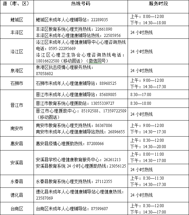 據泉州市教育局思政科有關負責人介紹,為保障廣大學生以陽光健康的心態開展居家學習生活,泉州市本級和各縣(市、區)開通了20條學生心理服務熱線,向受疫情影響需要情緒疏導,以及對自身健康存有疑慮,需要心理支持的學生群體提供公益性咨詢服務。全市學生心理服務熱線如下: