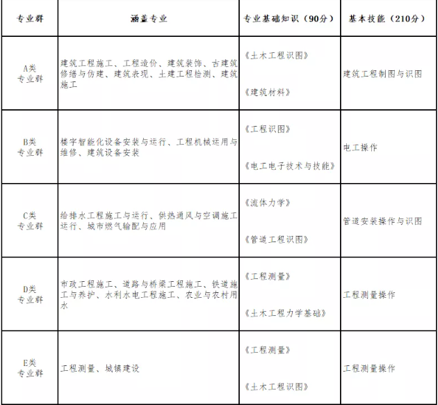 根據省教育廳下發的《山西省中等職業學校畢業生對口升學考試土木水利類專業職業技能考試大綱(試行)》,本專業職業技能考試分專業基礎知識考試和基本技能考試兩部分,滿分300分,其中,專業基礎知識占90分,基本技能占210分,考試成績結果體現為“合格”和“不合格”。考試內容如下: