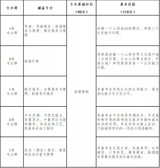根據省教育廳下發的《山西省中等職業學校畢業生對口升學考試旅游服務類專業職業技能考試大綱(試行)》,本專業職業技能考試分專業基礎知識考試和基本技能考試兩部分,滿分300分,其中,專業基礎知識占90分,基本技能占210分,考試成績結果體現為“合格”和“不合格”。考試內容如下: