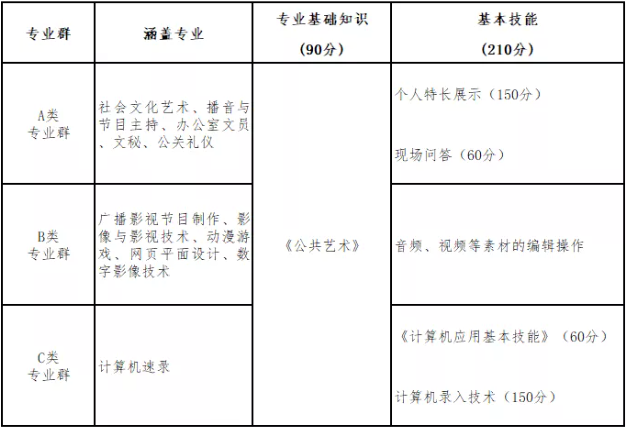 專業基礎知識考試采用機試辦法,考試時間60分鐘;基本技能考試辦法如下:A類專業群以面試的形式進行考查,分為個人專業特長展示和現場問答兩部分,每個考生不少于5分鐘;B類專業群為音頻、視頻等素材的編輯操作,考試時間60分鐘;C類專業群為機試,考試時間120分鐘。