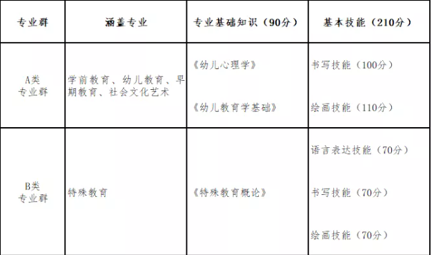 根據省教育廳下發的《山西省中等職業學校畢業生對口升學考試教育類專業職業技能考試大綱(試行)》,本專業職業技能考試分專業基礎知識考試和基本技能考試兩部分,滿分300分,其中,專業基礎知識占90分,基本技能占210分,考試結果體現為“合格”和“不合格”??荚噧热萑缦拢?/span>
